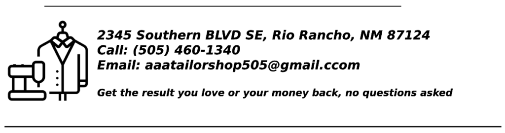 Monday – Friday: 09:00 AM – 6:00 PM Saturday – Sunday: By Appointment Only (505 – 460 -1340) | aaatailorshop505@gmail.com